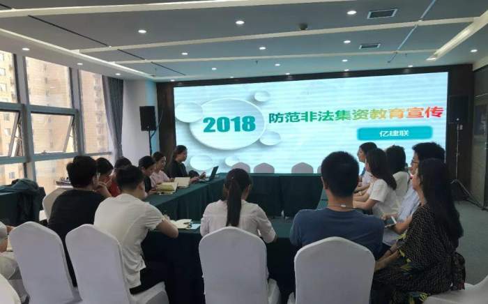 近日,为提升平台客户及员工防范非法集资能力,增强风险防范意识,引导客户培养正确的投资理念、自觉远离和抵制非法集资,营造防范非法集资和互联网金融风险的良好舆论宣传氛围,亿建联积极组织开展非法集资风险防范宣传培训及排查活动,并对公司内部员工进行了自查。