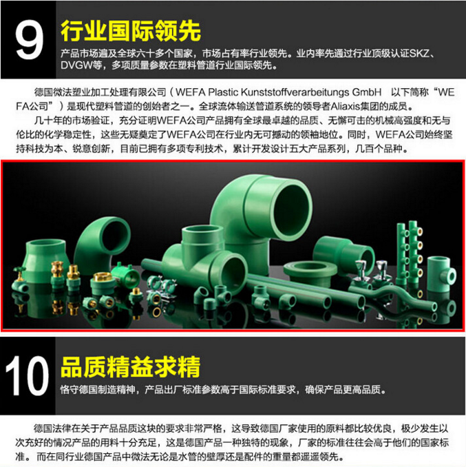 德国微法公司(WEFATHERM GmbH以下简称“WEFA公司”)是现代塑料管道的创始者之一。公司坐落于德国文斯托夫。WEFA公司多年来,不断拓展和巩固国内外市场,旗下产品遍及全球六十多个国家和地区,覆盖区域和市场占有率在全球同行业中处于领先地位。公司已成为全球最受欢迎和最受尊敬的管道系统供应商之一。几十年的市场验证,充分证明WEFA公司产品拥有全球最卓越的品质、无懈可击的机械高强度和无与伦比的化学稳定性,这些无疑奠定了WEFA公司在行业内无可撼动的领袖地位。同时,WEFA公司始终坚持科技为本、锐意创新,已拥有多项专利技术,累计开发设计五大产品系列,几百个品种。