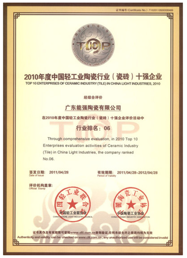 公司聚集了过百名的研发精英以及管理人才,无论产品的品种开发,品质监控和营销策略,都走在同行的前列。我们积极开展与国内外著名研究所的技术交流合作,不断推出创新市场的产品,多项产品通过省级新产品鉴定。能强陶瓷先后获得“ISO9001:2008质量管理体系认证”、 “国家3C强制性认证”、“ISO14001:2004环境管理体系认证”、 “中国陶瓷行业名牌产品”、 “建材环保产品认证”、 “广东省名牌产品”、 “中国驰名商标”、“广东省著名商标” 、“中国家居行业十大影响力品牌”、 “中国陶瓷行业十大绿色品牌”、 “2013陶瓷十大品牌”等多个国家级荣誉称号。