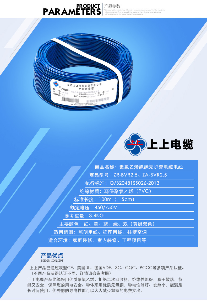 上上电缆ZR-bvr 2.5平方家用电线价格铜芯软电缆单芯多股家装软线